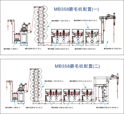 本機由MB358A兩輥碳纖維、MB358B兩輥砂皮、MB358C四輥砂皮、MB358G十輥烘筒、LMV323FB兩輥軋車、MB358E四輥清理及MB358H出布擺布機構(gòu)等根據(jù)工藝要求需要選配組合而成。