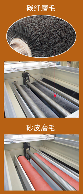 隨著磨毛織物在服裝面料上的大規(guī)模采用,磨毛織物的生產(chǎn)也越來越受到廠家的重視。磨毛機是織物的后整理設(shè)備,織物經(jīng)磨毛后表面豐滿挺括、手感絨柔舒適,布匹厚重感增強。MB358型砂皮與碳纖維組合磨毛機,具有適應(yīng)范圍寬、自動化程度高、傳動簡練、操作方便等優(yōu)點,適用于機制布、低彈性織物的磨毛,磨毛輥采用鋼輥包覆砂紙的形式?;驗槟チ夏猃埥z形式,適用于織物的柔式磨毛,對織物表面纖維損傷程度小,起到使織物柔軟、產(chǎn)生做舊的效果,這兩種結(jié)構(gòu)基本一致。