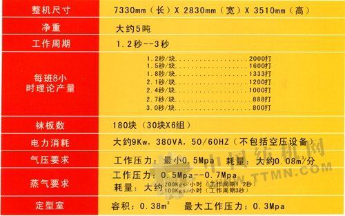 3、本機(jī)采用先進(jìn)的變頻原理,襪板的工作周期可根據(jù)定型工藝要求做任意調(diào)節(jié)。最短工作周期是1.2秒,最大產(chǎn)量每8小時班產(chǎn)量約2000打(按理論數(shù)據(jù)計算)。