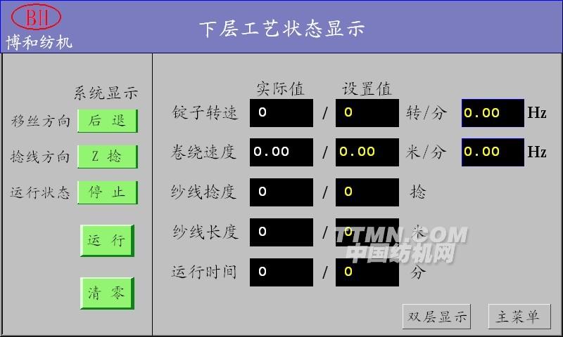 該控制系統(tǒng)采用基于隆昌倍捻機(jī)專用運(yùn)動(dòng)控制LCBNJ-10和WEINVIEW系列觸摸屏的捻線機(jī)自動(dòng)控制系統(tǒng)。通過LCBNJ-10運(yùn)動(dòng)控制完成了捻線機(jī)系統(tǒng)中橫動(dòng)電機(jī),卷繞電機(jī)和錠子電機(jī)的轉(zhuǎn)速控制,并通過WEINVIEW系列觸摸屏可以完成各項(xiàng)數(shù)據(jù)和參數(shù)的設(shè)置,快速完成紗線產(chǎn)品的生成工藝的變換。