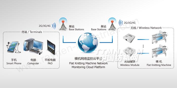 橫機(jī)網(wǎng)絡(luò)管理系統(tǒng)通過有線/無線局域網(wǎng)聯(lián)網(wǎng)技術(shù)與管理軟件,來控制和管理本地的橫機(jī)機(jī)群,用戶可以通過電腦、平板電腦、手機(jī)等終端來訪問管理軟件,實(shí)現(xiàn)對(duì)橫機(jī)的監(jiān)控和生產(chǎn)管理。