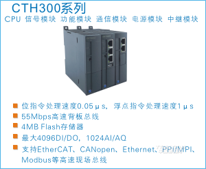 CTH300系列中型PLC,高速度高精度大容量大點(diǎn)數(shù)、集各種復(fù)雜控制算法于一體并支持多種現(xiàn)場(chǎng)總線的控制系統(tǒng)。