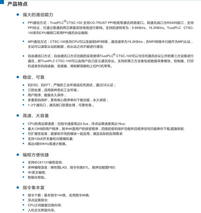 TrustPLC CTSC-100系列是新一代的高性能、性價(jià)比很高的可編程邏輯控制器件,其緊湊的設(shè)計(jì)、強(qiáng)大的指令以及優(yōu)越的性能、能夠適用于各行各業(yè),滿足很多小規(guī)模系統(tǒng)的復(fù)雜控制需求。
